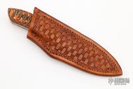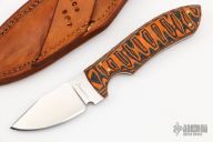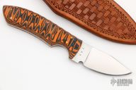 This Skinner by Ron Jamieson features a satin finished blade with .133" blade stock and 1.124" blade depth, full tang construction. The handle has black/orange G-10 scales with brass pins. Comes with a hand tooled brown leather sheath. Excellent condition.  #597
