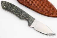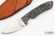 This Skinner by Ron Jamieson features a satin finished blade with .145" blade stock and 1.112" blade depth, full tang construction. The handle has black/green G-10 scales with brass pins. Comes with a hand tooled brown leather sheath. Excellent condition.  #594
