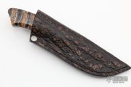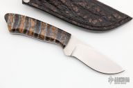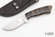 This Hunter by Arno Bernard features a hand rub satin finished drop point blade, .112" blade stock and .832" blade depth, full tang construction. The handle has mammoth molar scales. Comes with a cape buffalo sheath and the original box.  Excellent Condition.