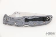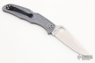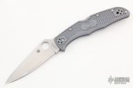 This Endura lock back folding knife by Spyderco features a flat ground satin finish blade with a grey FRN handle. Has "SuperBlue/420J1" steel blade. Has some light scratches, otherwise good condition. Blade Steel: Super Blue/420J1