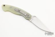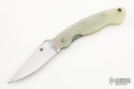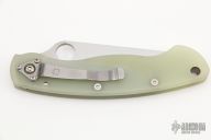 This Military by Spyderco has a satin finished blade with notched thumb rest and thumb hole. Handle is jade G-10, with stainless steel single liner (lock), standoffs, stainless steel tip down clip, and lanyard tube pin. Has a couple spots on the blade, otherwise excellent condition. This knife was a Blade HQ Exclusive.
