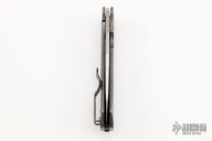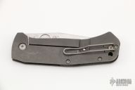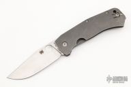 This Slysz Bowie by Spyderco features a tumble finished blade with notched thumbrest and thumbhole. The handle has a tumble finished titanium frame with notched black G-10 backspacer and tip up, left or right reversible clip. Nice detent, lockup and blade seating. Has some scuffs, otherwise good condition.