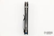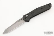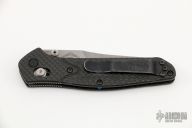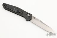 This 940S-1 Obsorne Axis Lock Folder by Benchmade has a stonewashed clip point blade with swedge and dual thumb studs. Handle is carbon fiber with blue anodized aluminum stand-offs and black stainless steel tip up clip (RH/LH carry). Centered blade and smooth action. Has a few light scuffs, otherwise excellent condition.