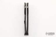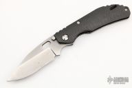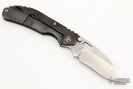 This DCG BBNS Framelock Folder has a gun metal finished recurve blade with dual thumbstuds and thumbhole. Handle has a carbon fiber and black PVD titanium frame. Centered blade and great lockup and detent with zero blade play. Has scuffs and scratches. a couple spots on the blade, otherwise good condition.