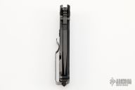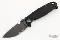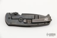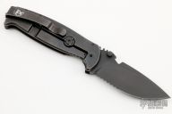 This HEST/F 2.0 Triple Black Special Edition from DPx features a black coated drop point partially serrated Niolox blade with bottle opener, dual thumb studs and notched thumb rest that doubles as wire strippers. The handle is comprised of textured black G10 scale and black titanium lockside over a black polymer backspacer. Black steel pocket clip. The lockside features a "Roto-Lok" lockbar stabilizer that can be rotated to turn the knife into a virtual fixed blade. Comes with zipper case. Blade rubs the right side of the frame, and the lock-up is slightly late. Has some scuffs, scratches, marring on the hardware, great condition otherwise.
