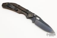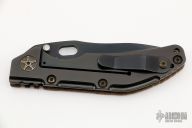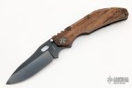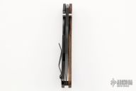 This DDC BBNL Framelock Folder has a black PVD finished V-ground blade with dual thumbstuds and thumbhole. Handle has wood from the USS California decking, black PVD titanium frame and tip up clip, and titanium barrel spacers. Centered blade and great lockup and detent with zero blade play. Comes with velcro case and makers card. Has a few light scuffs, otherwise excellent condition.