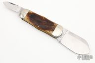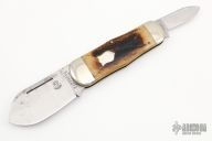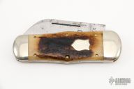 This Tidioute Whaler Toenail by Great Eastern Cutlery has two 1095 carbon steel blades with nail nicks. The handle has double nickel silver bolsters, muscle bone covers with a nickel silver shield escutcheon, brass liners, steel springs. Comes with original tube packaging. The blades have been reground by Tom Krein. Has some scratches and patina, otherwise good condition.