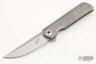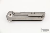 This Warrior One Mid-Tech knife by Liong Mah features a stonewashed upswept blade with notched thumbrest and swedge. The handle has a stonewashed titanium frame and tip up clip. Rides on raced bearings. Nice detent, lockup and blade seating. Has a couple light scratches, otherwise excellent condition.