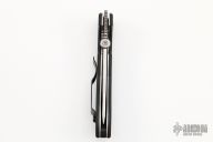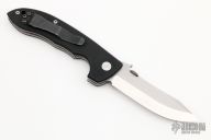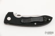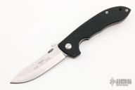 This Emerson Horseman linerlock folder has a tumble finish blade with swedge, thumb disc, notched thumb rest and wave feature. The handle is comprised of black G10 scales over titanium liners and  black spacers. #0541. Comes with Emerson Box. Light scuffs and scratches are visible on the blade and handle otherwise the knife is in great condition.