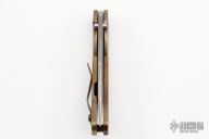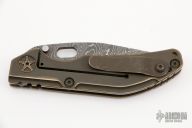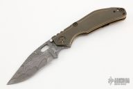 This DDC BBN-M by Duane Dwyer features a Chad Nichols San Mai Damascus blade with thumbhole. The handle has an anodized titanium frame with tip up anodized titanium clip, left or right reversible, anodized titanium hardware. Nice detent, lockup and blade seating. Comes with canvas velcro case and makers card. Has some scuffs and scratches, otherwise good condition.