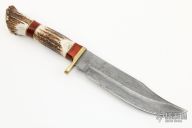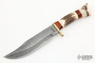 This bowie by Marble's features a Damascus blade with false top edge, .188" blade stock and 1.508" blade depth, hidden tang construction. The handle has a brass guard, stag grip and butt with wood and brass spacers. Comes with original box. Has some scratches and patina, otherwise good condition.