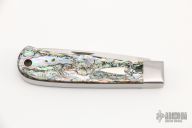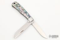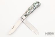 This Bullnose Trapper Slipjoint by Case is a Tony Bose design. It has a satin finished blades with nail nicks. Handle is abalone with stainless steel escutcheon, satin finished stainless steel bolsters, liners, and springs. Centered blades. Excellent condition . Comes with Case suede leather padded zipper case, and original box and paperwork.