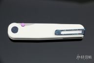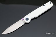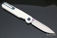 The Rockwall by Tactile Knife features a stonewashed Magnacut blade with notched thumbrest and dual thumbstuds. The handle has a white Nexus milled titanium frame with a tip up stainless steel clip and backspacer. Comes with original box and COA. New condition.