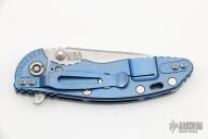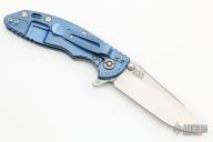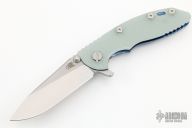 This 3" Slicer XM-18 flipper from Hinderer Knives has a stonewashed blade with notched thumbrest and flipper, no choil. Jade G-10 scale and an anodized and stonewashed titanium frame and clip. Reversible pocket clip. Strong lock up, nice detent and blade seating is center. Includes original box, extra bushings and papers. New condition.