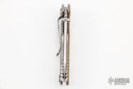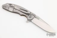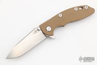 This 3" Slicer XM-18 flipper from Hinderer Knives has a stonewashed blade with notched thumbrest and flipper, no choil. Coyote brown G-10 scale and a stonewashed titanium frame and clip. Reversible pocket clip. Strong lock up, nice detent and blade seating is center. Includes original box, extra bushings and papers. New condition.