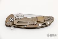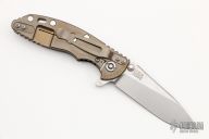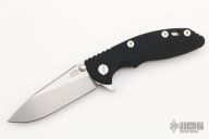 This 3" Slicer XM-18 flipper from Hinderer Knives has a stonewashed blade with notched thumbrest and flipper, no choil. Black G-10 scale and an anodized and stonewashed titanium frame and clip. Reversible pocket clip. Strong lock up, nice detent and blade seating is center. Includes original box, extra bushings and papers. New condition.