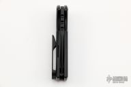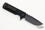 This Chaves T.A.K. features a black finished drop point blade with the Chaves logo and a notched thumbrest. The handle has black G10 scales over black titanium liners and a matching reversible skull pocket clip. Comes with original box and extra clip. Excellent condition.