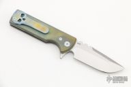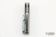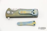 This Chaves T.A.K. features a satin finished drop point blade with the Chaves logo and a notched thumbrest. The handle has "ghost" finished titanium scales over bead blast finish titanium liners and a matching reversible skull pocket clip. Comes with original box and extra clip. Excellent condition.
