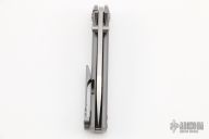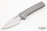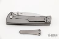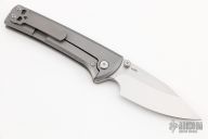 This Chaves Scapegoat features a satin finished drop point blade with the Chaves logo and dual thumbstuds. The handle has a stonewashed titanium frame and a matching skull pocket clip. Includes an interchangeable titanium clip. Comes with original box and extra clip. Excellent condition.