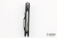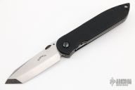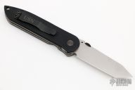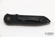 This Suspect 6 by Ernie Emerson features a chisel ground tanto blade with stonewashed flats, thumbdisc, no wave feature and notched thumbrest. Rides on bearings, nice detent, lockup and blade seating. The handle has black G-10 scales, tumbled titanium liners, black stainless steel clip reading "USN". Comes with a zippered case. Excellent condition.