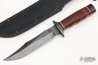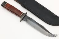 This S1 Bowie (Vietnam 5th Special Forces Group) has a black coated clip point blade with hidden tang and double guard. Blade width is just under 1/4", depth 1-1/4". Handle is contoured stacked leather with white spacers, black coated steel butt cap and lanyard hole. Comes with a black leather sheath. Very Rare. Blade is marked "SOG SPECIALTY KNIVES" on the presentation side. The non-presentation side has the Special Forces crest on the ricasso and "VIETNAM 5th Special Forces Group" on the swedge.  Has a couple light scratches, otherwise excellent condition.