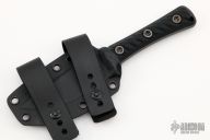 The Utsidihi comes with a molded kydex scabbard including two MAD straps that allow for scout carry (horizontal) and inside the waistband (IWB) vertical carry. The scabbard is intentionally more snug on this model so it can be run upside down if you would like. The scabbard is MOLLE compatible so it can be attached to any pack, plate carrier or similar gear with PALS webbing. The scabbard will work with most of the popular clips and mounts like the Discreet Carry Concepts Clip and UltiClip.