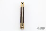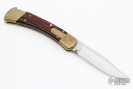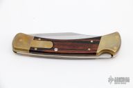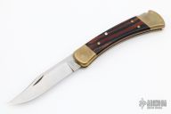 "This old classic BUCK knife 110 "Folding Hunter" was first introduced in 1965 - it has been BUCKS mainstay ever since. Some say the Buck 110 is the most copied knife in the world. This Buck automatic knife has a beautiful dymondwood scales with brass bolsters and a plate that opens knife automatically. A must for any BUCK collection." Has some scratches, otherwise good condition. Left Handed. Comes with a zippered case.