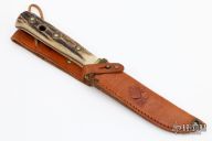 This "Hunter's Friend" by Puma features a satin finished blade with single sided fuller and swedge near tip. The handle has stag scales with brass rivets and a brass guard. This piece is in good condition, shows scratches/scuffs. Comes with original brown leather sheath with belt loop.