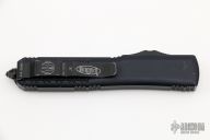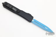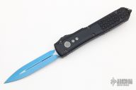 This Ultratech OTF automatic by Microtech features a D/E blue blade. Black aluminum contoured frame with black tip down stainless steel clip. Dated 04/2016 and s/n 00297. Has some scuffs and scratches, has been used and carried, otherwise good condition.  Comes with original box and papers.
