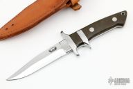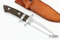 This Baby Bear Sub-Hilt Fighter by Zac Buchanan features a mirror polished blade with a sharpened top edge, .172" blade stock and .972" blade depth, full tapered tang construction. The handle is comprised of stainless steel guard and subhilt, green canvas micarta scales and thin red liners, lanyard hole at the butt. Includes a brown leather sheath with belt loop. New condition.