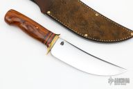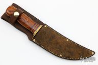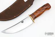 This BIG 6 by Jim Behring features a satin finished convex ground upswept blade with a false top edge, .185" blade stock and 1.642" blade depth, hidden tang construction. The handle features a brass guard, black/brass/micarta/red/yellow spacer pattern, premium iron wood handle with brass pin. Great look and feel. Comes with brown leather sheath with giraffe panel. New condition.