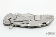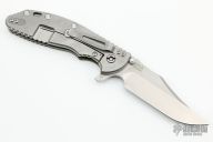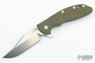 This Bowie Ground XM-24 from Hinderer Knives features a stonewash finished bowie blade with dual thumbstuds and notched thumbrest and flipper. The handle has a textured green G-10 scale and stonewashed titanium frame over titanium barrel spacers, filler tab and tip up clip, lockbar stabilizer.  Includes original box and extra hardware. New condition.