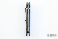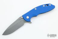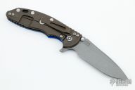 This XM-18 flipper from Rick Hinderer Knives features a 3.5" working finished S45VN blade, notched thumbrest and flipper, dual thumbstuds. The handle has a blue G-10 scale, and a Battle Bronze titanium handle/clip. Clip can be mounted for tip up or down carry. Nice lockup, seating, and detent.  Comes with original box, papers, and extra pivot washers. New condition.