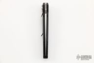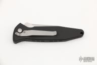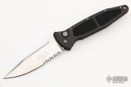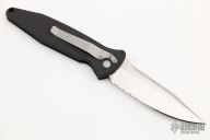 This Mini Socom Auto by Microtech Knives features a hand rub satin finished clip point blade with partial serrations, swedge and notched thumbrest. Black aluminum frame with nonslip inserts, tip down bead blasted stainless steel clip. Nice lock up and blade seating. Comes with original sheath. The satin finish was done by G. Brend, Walter Breden's daughter.  Excellent condition.