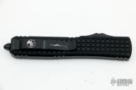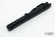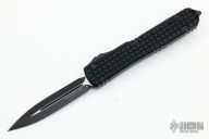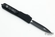 This Ultratech OTF automatic by Microtech features a D/E black DLC fluted blade. Black aluminum frag pattern frame with black tip down stainless steel clip. Dated 12/2022 and s/n 174. Excellent condition. Includes original box and papers.