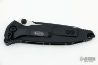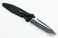 This Socom Elite manual linerlock folder by Microtech Knives has a two-tone black tanto fully serrated blade with notched thumbrest and dual thumbstuds. Has a black aluminum handle with non-slip inlays, tip down black stainless steel clip and hardware. Serial number 11432 and dated 11/2022. Comes with original box and papers. Excellent condition.