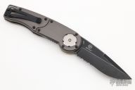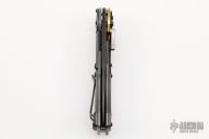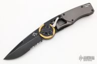 This is a knife from the GH-Series Gearhead folding knife by Mantis Knives. The "steampunk-style" Gearhead liner lock folder is equipped with a unique gear-driven pivot with one large gear, three small gears and a thumb lever used to deploy the blade when pushed down. It features a flat 3.38" plain edge tanto blade and measures just under 5" when closed. The gray handle scales are made from aluminum with a stainless steel backspacer and tip-up pocket clip. The GH2022DPBS Gearhead comes in a black stonewashed finished blade but is available in a variety of styles and finishes.