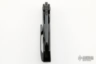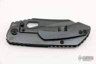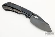 This Evolution 3.0 by Custom Knife Factory features a black satin finished blade with notched thumbrest and thumbhole. The handle has a black bark finished titanium frame with a matching tip up clip and backspacer. Comes with velcro case and COA. Nice detent, lockup and blade seating. New condition. #693 and dated 10-22