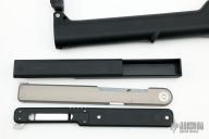 The fixed blade, serrated, drop-point Survival Knife, was built to complement the other COMBAR™ tools and fit snugly inside the hollow shaft. The knife has a slim and compact design with a glass-reinforced polymer ergonomic handle and an integrated belt clip sheath that fits inside the skeletonized knife handle.