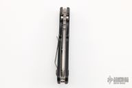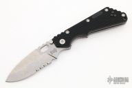 This is a Buck made Strider SNG Tarani has a stonewashed blade with notched thumbrest, thumbhole, partially serrated edge, and textured blade. The handle has textured black  scales, stainless steel liners and reversible tip up carry clip. Notching on thumbrest area and front/rear of handle provide a solid grip. Excellent condition. Comes with original box and papers. Discontinued.