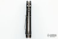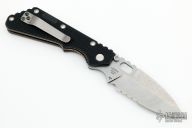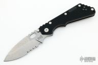 This is a Buck made Strider SNG Tarani has a stonewashed blade with notched thumbrest, thumbhole, partially serrated edge, and textured blade. The handle has textured black  scales, stainless steel liners and reversible tip up carry clip. Notching on thumbrest area and front/rear of handle provide a solid grip. Excellent condition. Comes with original box and papers. Discontinued.