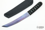 This Tanto by Warren Thomas features a chisel ground fingerprint anodized titanium blade with a carbidized edge, .126" blade stock and 1.076" blade depth. The handle is comprised of a Japanese style wrap over stingray skin. Includes kydex sheath. Excellent condition.