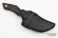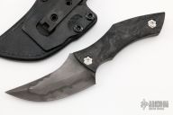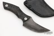 This Genesis by Jake McCoy features an upswept blade with false top edge and nice hamon, .216" blade stock and 1.650" blade depth, full tang construction with marble carbon fiber scales and titanium hardware. Comes with a black leather sheath by Chatanooga Leatherworks. Excellent condition.