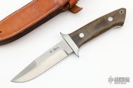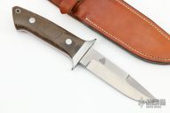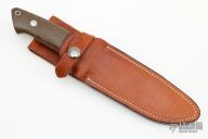 This Loveless Style Chute Knife by David Sharp features a tumble finished blade with a 2" sharpened top edge, .216" blade stock and 1.086" blade depth, full tapered tang construction. The handle has a satin finished stainless steel guard, brown canvas micarta scales with red liners. Comes with a brown leather sheath. Excellent condition.