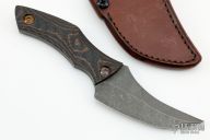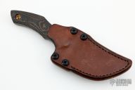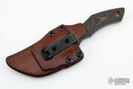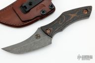 This Genesis Slim Line by Jake McCoy features an acid tumble finished upswept blade with false top edge, .151" blade stock and 1.562" blade depth, full tang construction with copper mesh carbon fiber scales and anodized titanium hardware. Comes with a brown leather sheath by Chatanooga Leatherworks. Excellent condition.