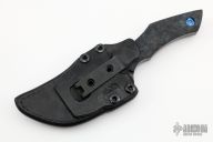 This Genesis Slim Line by Jake McCoy features an acid tumble finished upswept blade with false top edge, .217" blade stock and 1.618" blade depth, full tang construction with black/blue marble carbon fiber scales and anodized titanium hardware. Comes with a black leather sheath by Chatanooga Leatherworks. Excellent condition.