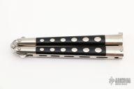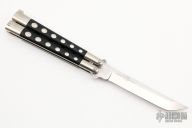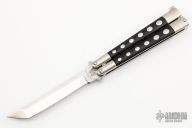 This International Series Balisong has a satin finished stainless steel blade. Handles have black zytel inlays. Has some light scratches, otherwise excelelnt condition.