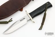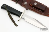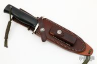 This Model 15 Airman by Randall Made Knives features a clip point blade with a sharpened top edge, .224" stock. 1.282" blade depth, full tang construction. The handle has black linen micarta Border Patrol style handle with a nickel silver guard. The Model 15 is designed especially for heavy-duty use and to be as nearly indestructible as possible. Comes with a brown leather sheath. Has been resharpened, has a couple scratches, otherwise good condition.