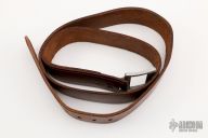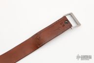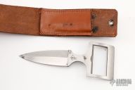 This is a belt buckle knife by Bowen USA. Has a double edged dagger blade, .170" blade stock and .991" blade depth, integral construction. Comes with a 36" brown leather belt. Comes with original box. Has some pitting on the blade and some scratches, otherwise good user condition.
