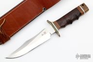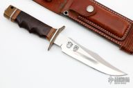 This SF-SOG Bowie by Al Mar Knives features a satin finished blade with a false top edge, .236" blade stock and 1.373" blade depth, hidden tang construction. The handle has a brass guard/pommel and stacked leather handle with aluminum, brass, red, white and black spacers. Comes with original brown leather sheath. Has some scratches and patina, has been resharpened, otherwise good condition.